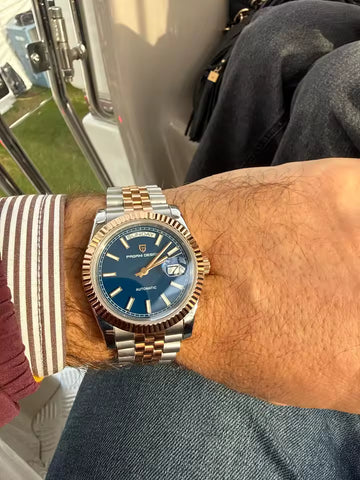 Die Pagani Design PD1752 steht für zeitlose Eleganz, präzise Technik und höchste Alltagstauglichkeit. Ausgestattet mit einem japanischen Automatikwerk bietet diese Uhr zuverlässige Leistung – ganz ohne Batterie. Das kratzfeste Saphirglas schützt das stilvolle, nummernlose Zifferblatt, während das massive Edelstahlgehäuse für Langlebigkeit sorgt.